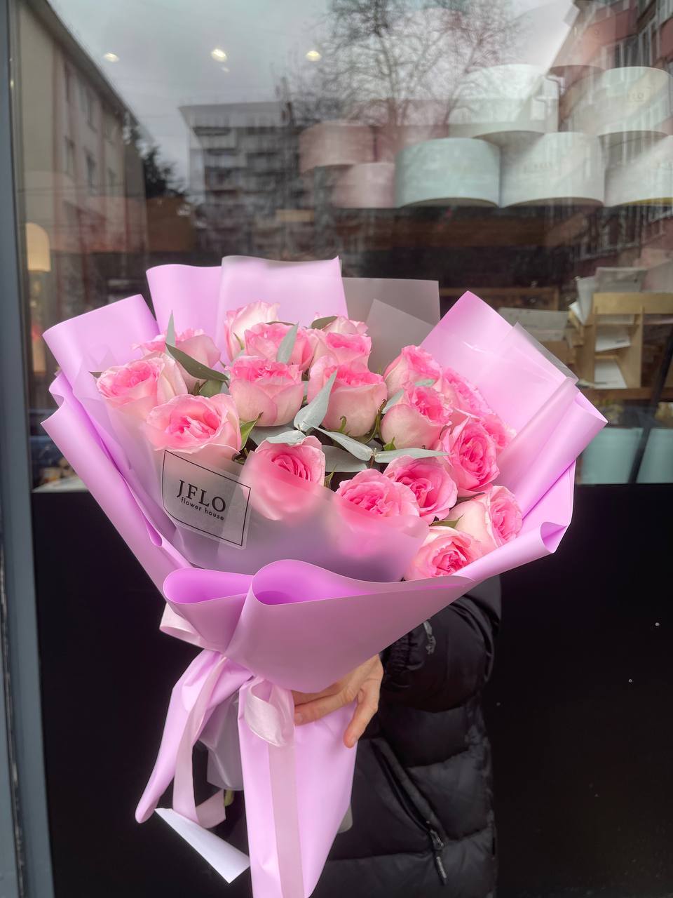 розовые розы, эвкалипт, пленка.