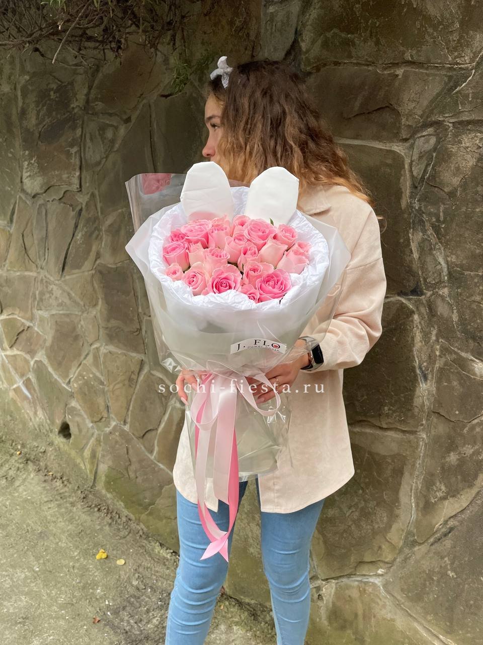 Двадцать одна роза в оригинальной упаковке с игривыми ушками создает настроение легкости и свежести. Розовые бутоны собраны в аккуратную композицию, которая удерживает форму и выглядит выразительно в любом интерьере.