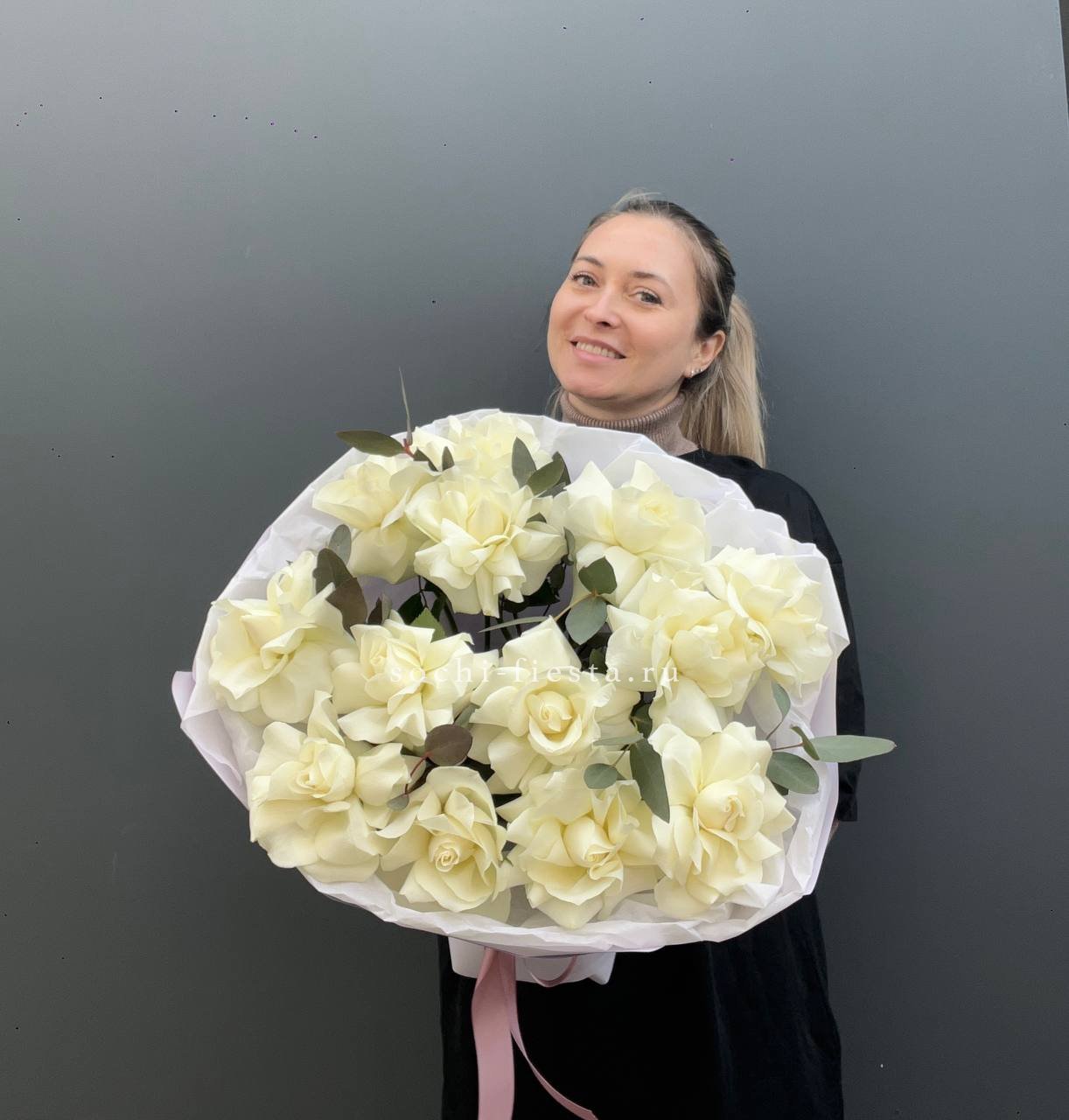Пять французских роз с вывернутыми лепестками раскрываются широко и создают эффект лёгкой небрежности. Эвкалипт поддерживает форму и добавляет свежести белому цвету.