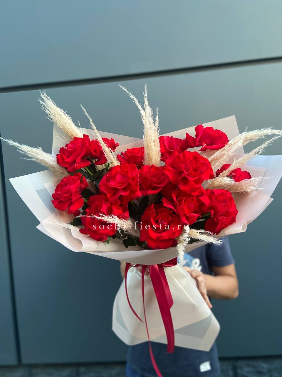 Глубокий красный тон распускающихся бутонов притягивает взгляд и удерживает внимание. Серебристая зелень эвкалипта создает прохладный фон для насыщенной палитры.