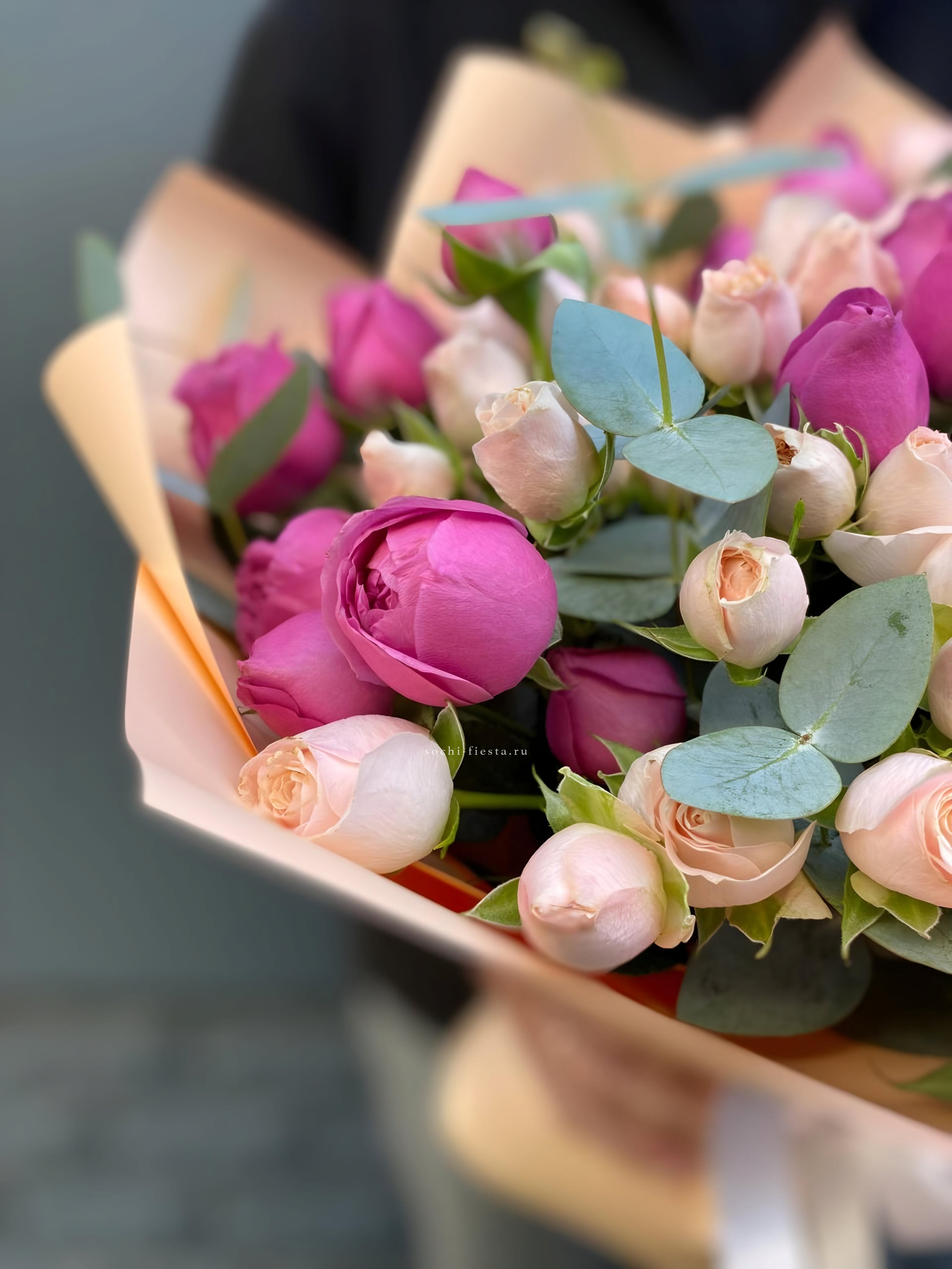 пионовидные кустовые розы, лента, дизайнерская упаковка.
