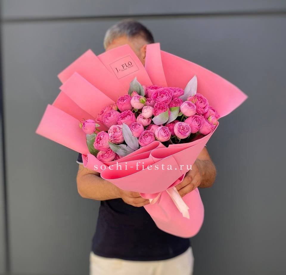 яркий букет из 13 пионовидных кустовых роз, лимониума и эвкалипта.