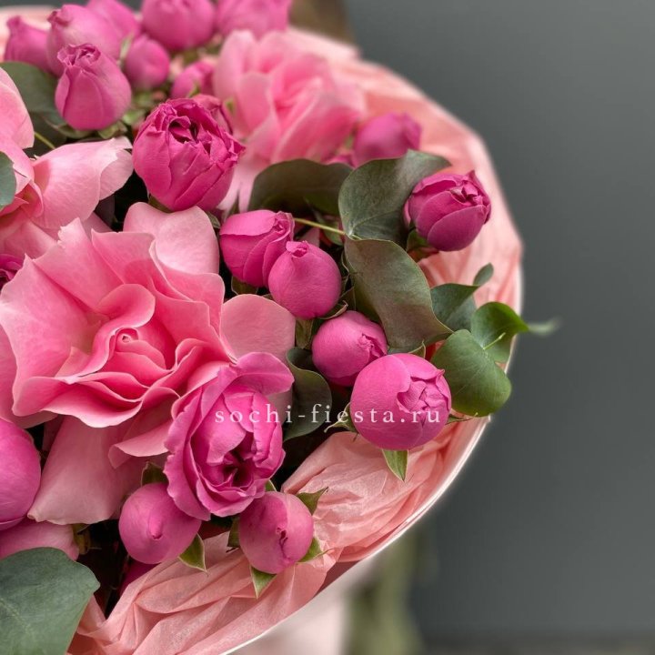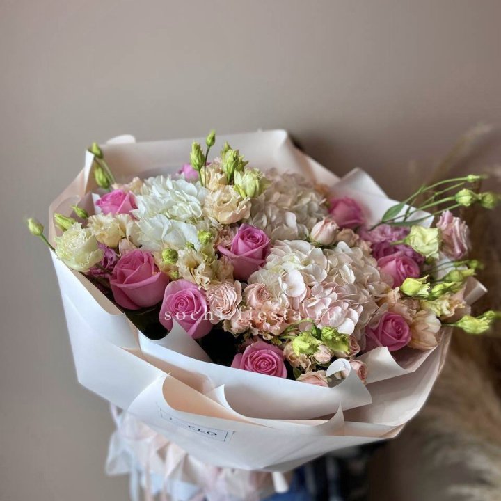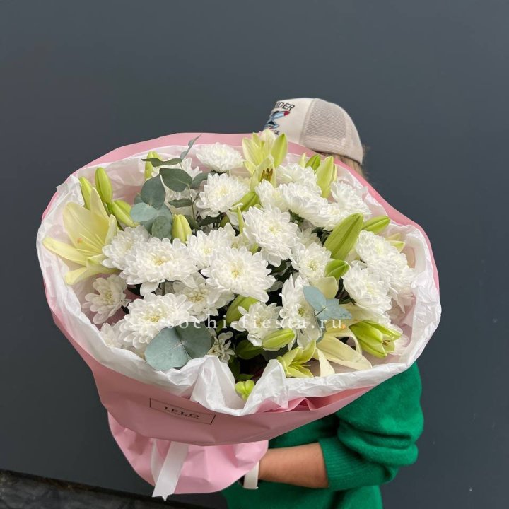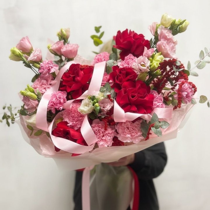 Зима и лето в Калуге — розы и хризантемы как основа. Эти виды стабильны в поставках круглый год. Флорист дополняет их сезонными акцентами: хвойные ветви зимой, открытая эустома летом. Сборный букет в любое время года выглядит живым и актуальным.