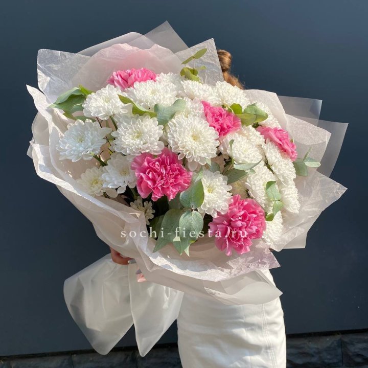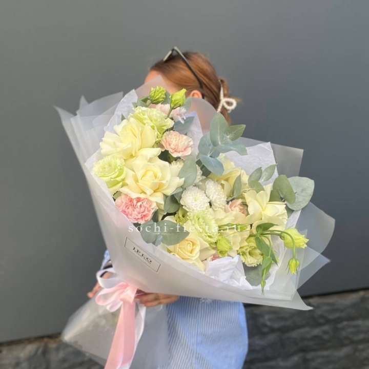 Зима и лето в Калуге — розы и хризантемы как основа. Эти виды стабильны в поставках круглый год. Флорист дополняет их сезонными акцентами: хвойные ветви зимой, открытая эустома летом. Сборный букет в любое время года выглядит живым и актуальным.