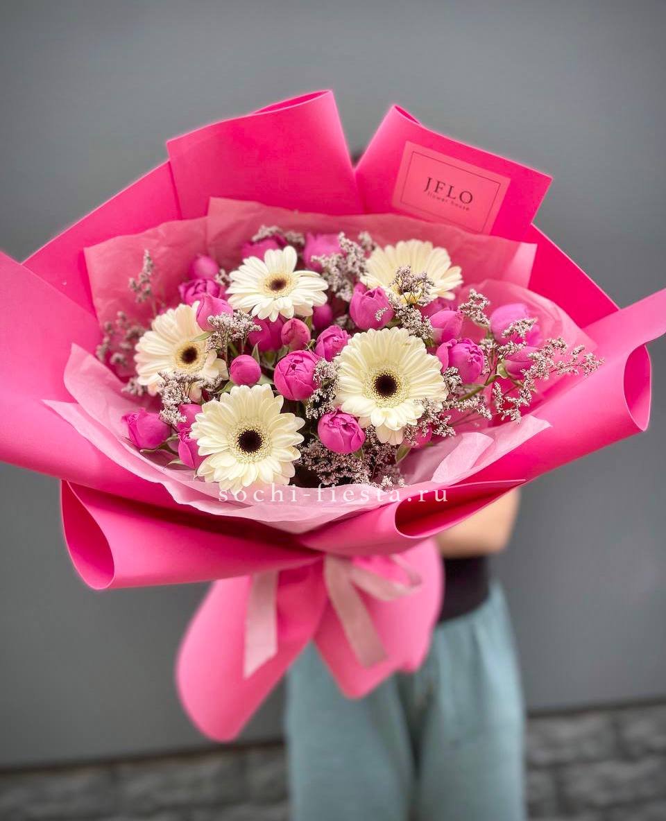 Сочные герберы рядом с пионовидными розами Мисти Бабблс образуют яркую композицию. Лимониум заполняет пространство между крупными бутонами и создает объем. Букет выглядит насыщенно и удерживает форму.