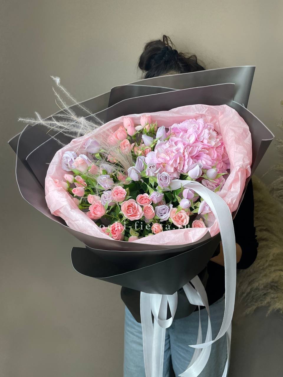 гортензия, роза кустовая, ковыль, лента, дизайнерская пленка.
