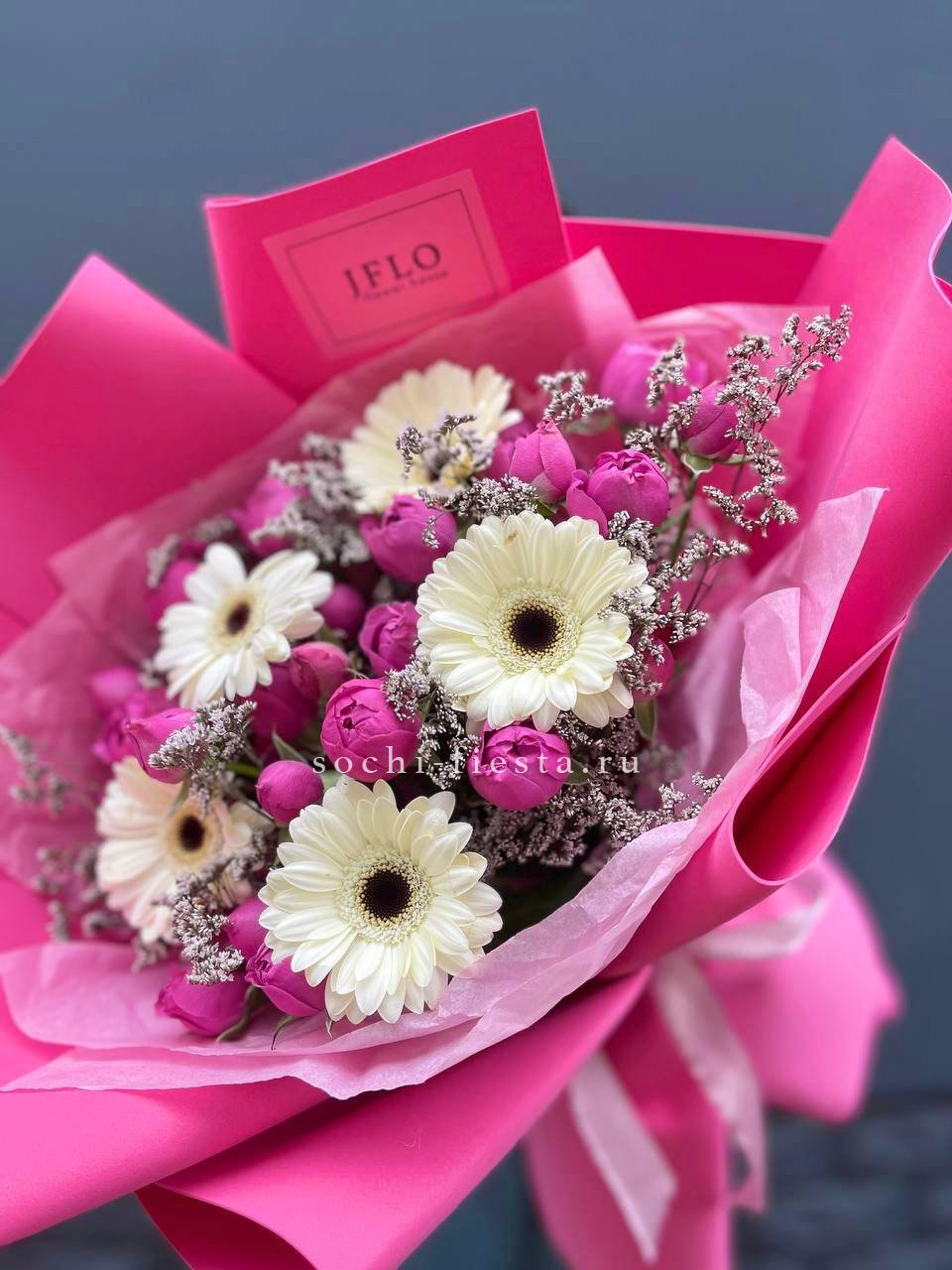 Состав букета: роза кустовая, хризантемы, озотамнус, диантус,  матрикария, упаковка, лента.