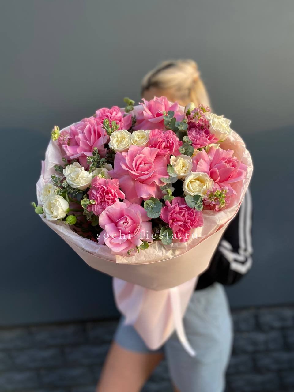 кремовые розы, эустомы (тон отличается от сезона), диантус, эвкалипт, оформление.
