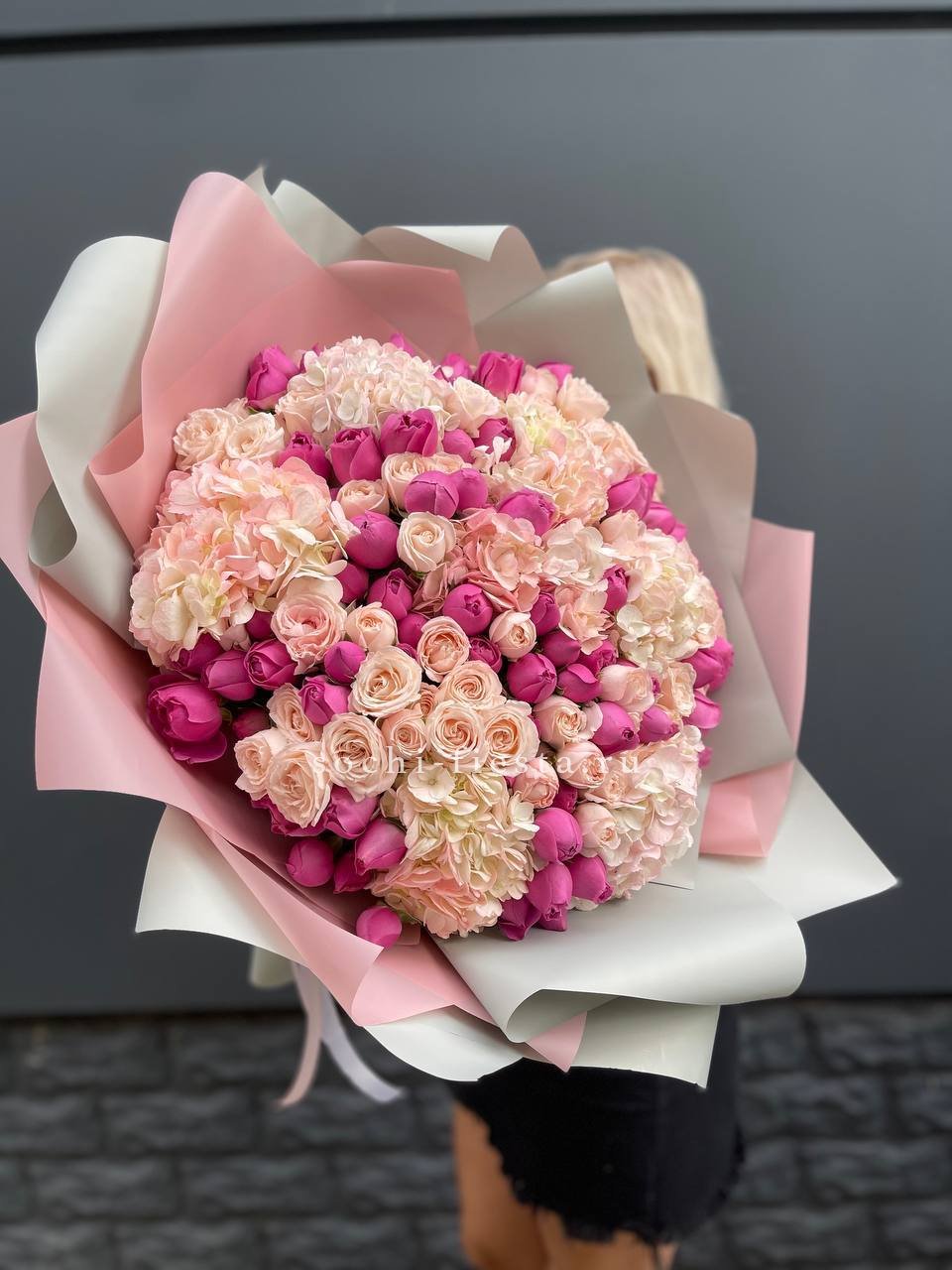 Пышные шапки гортензии задают объём, а россыпь кустовых роз создаёт живую текстуру по всей форме. Композиция наполнена воздухом и естественной лёгкостью.