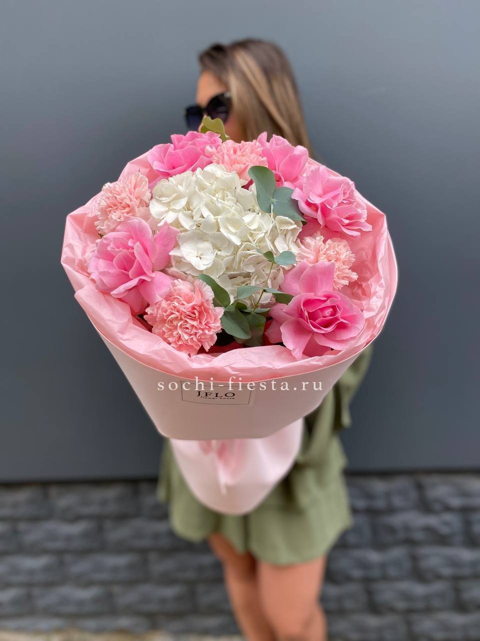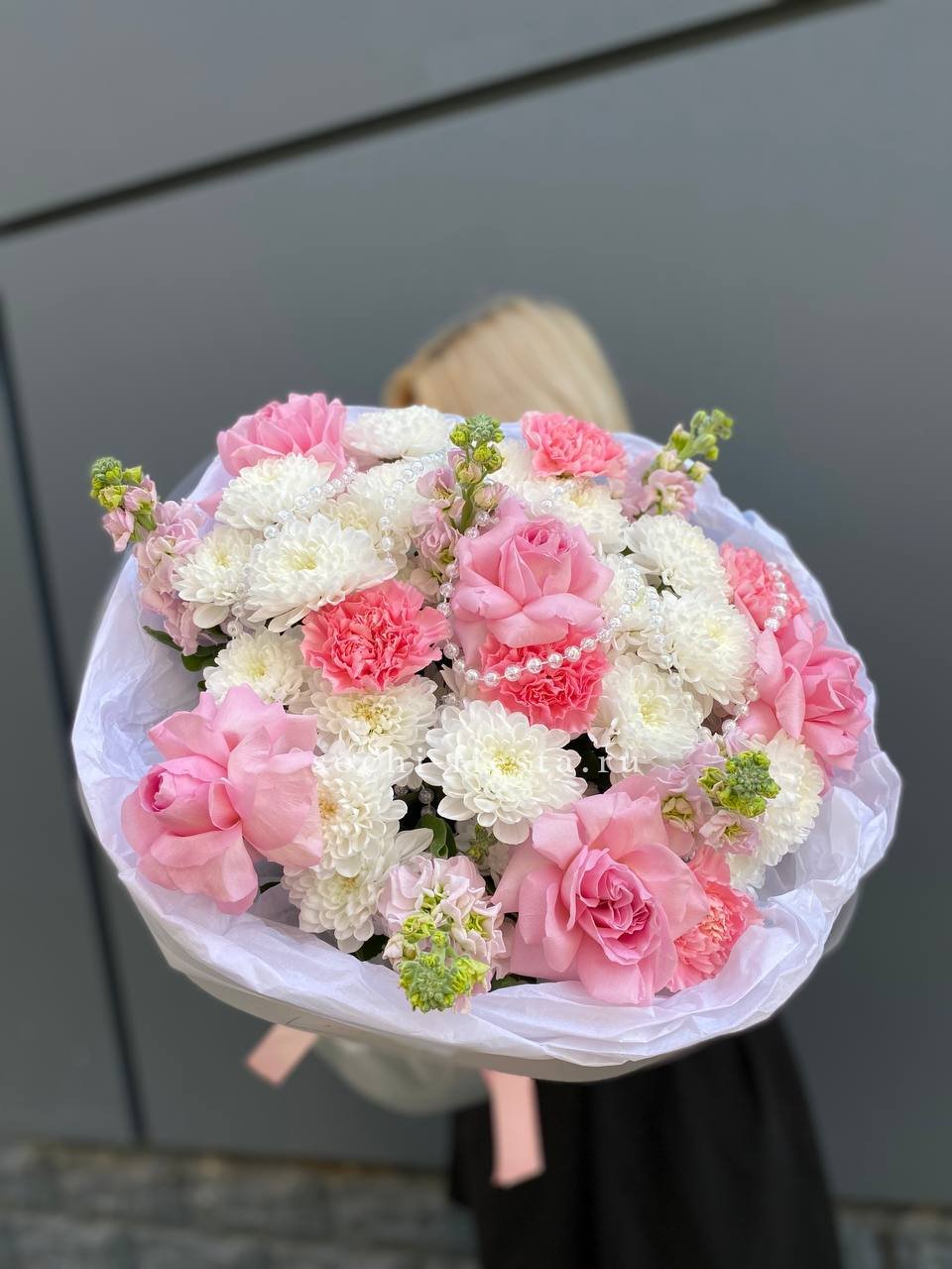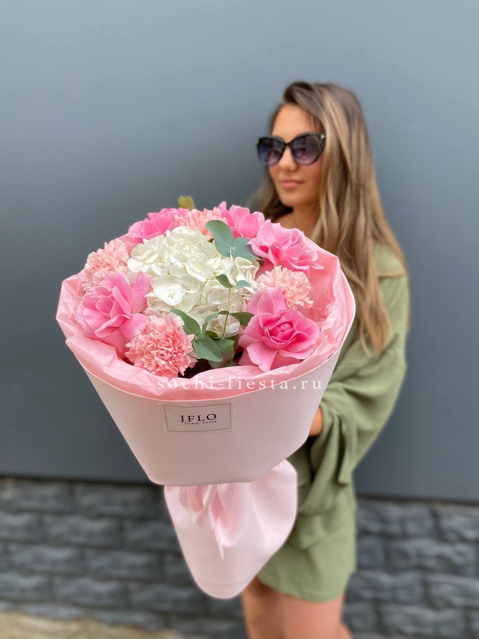 гортензия, хризантема, хамелациум, гербера, мисти баблс, диантус, пленка.