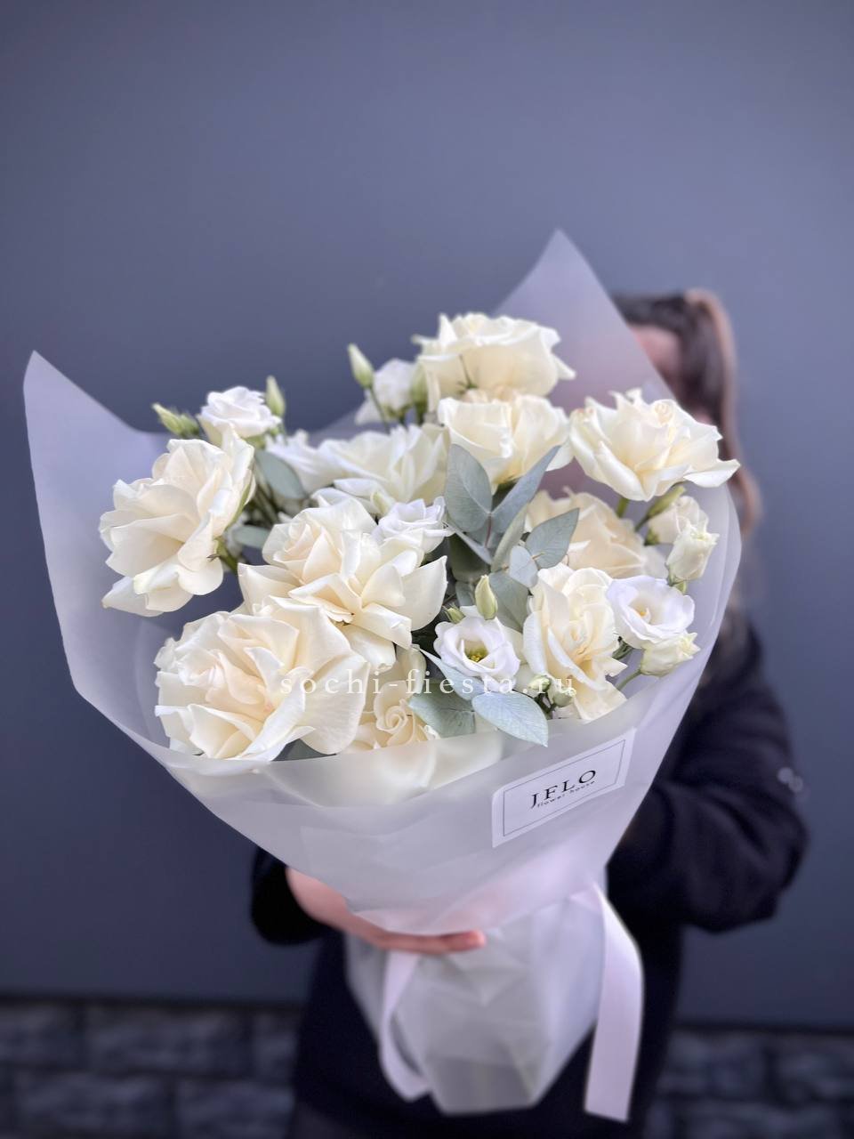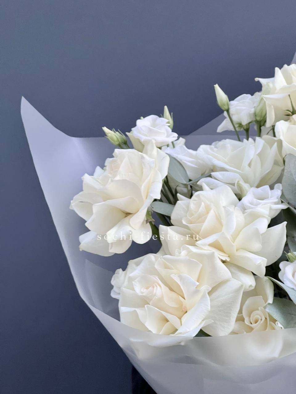 Белоснежные розы и пышные шапки гортензии сплетаются в плотную композицию, где эвкалипт задаёт спокойный ритм. Букет хорошо держит форму и долго сохраняет свежесть в вазе.