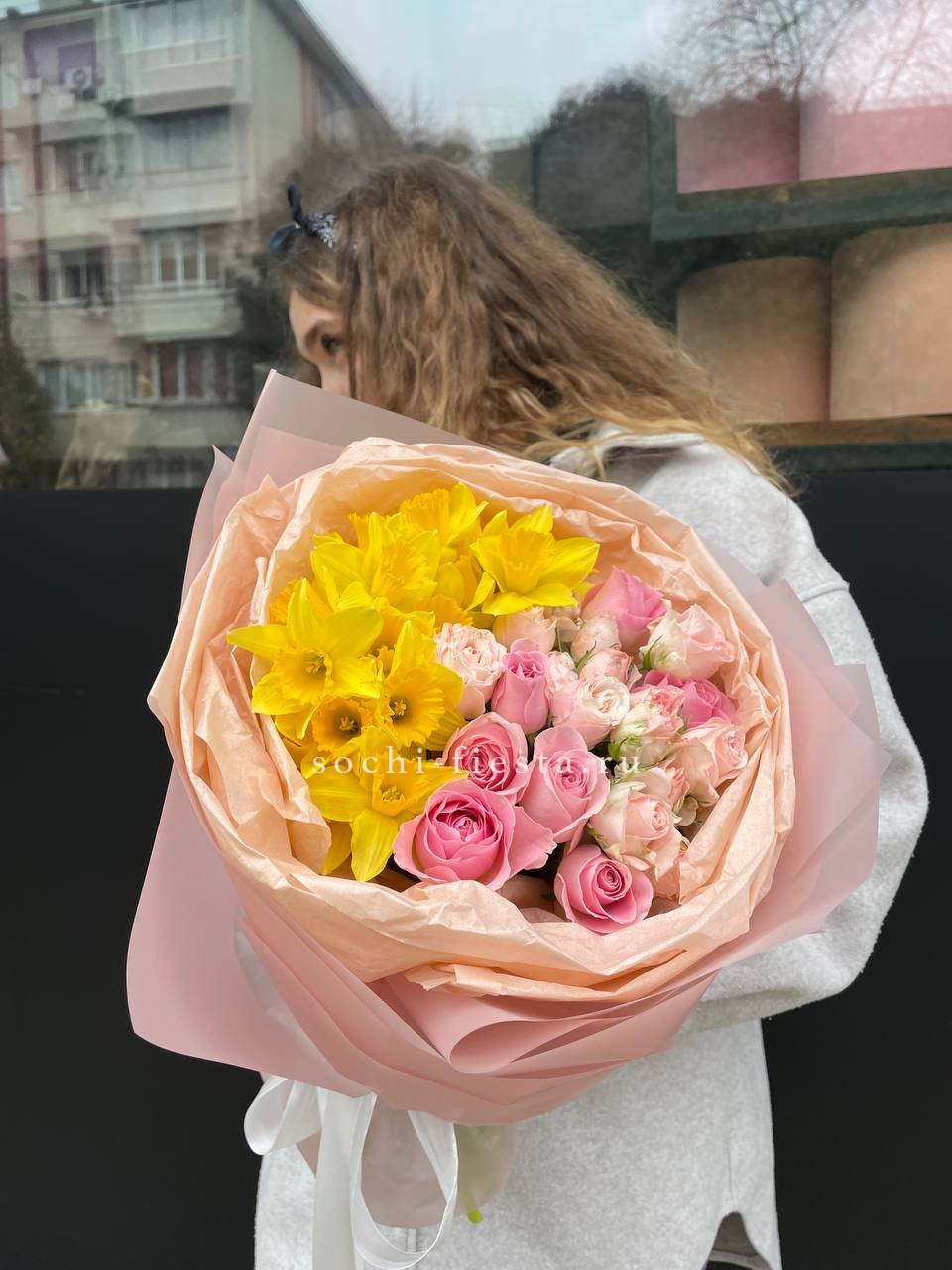 Весенние нарциссы встречаются с бархатными розами в одном букете. Пионовидные бутоны добавляют округлости, а белые и жёлтые оттенки перетекают друг в друга, создавая лёгкое цветовое движение.