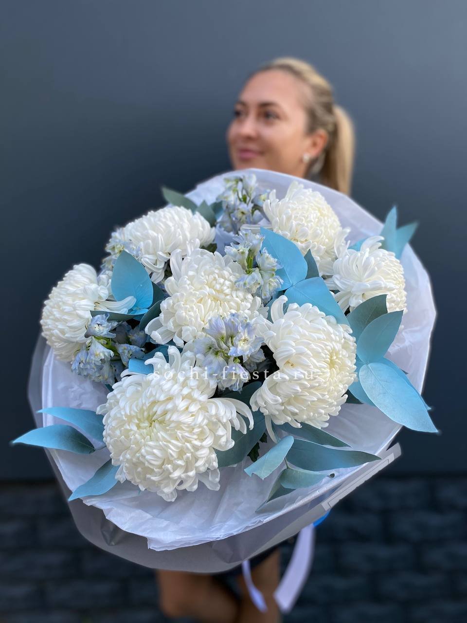 хризантема Бигуди, эвкалипт, дельфиниум, лента, дизайнерская упаковка.