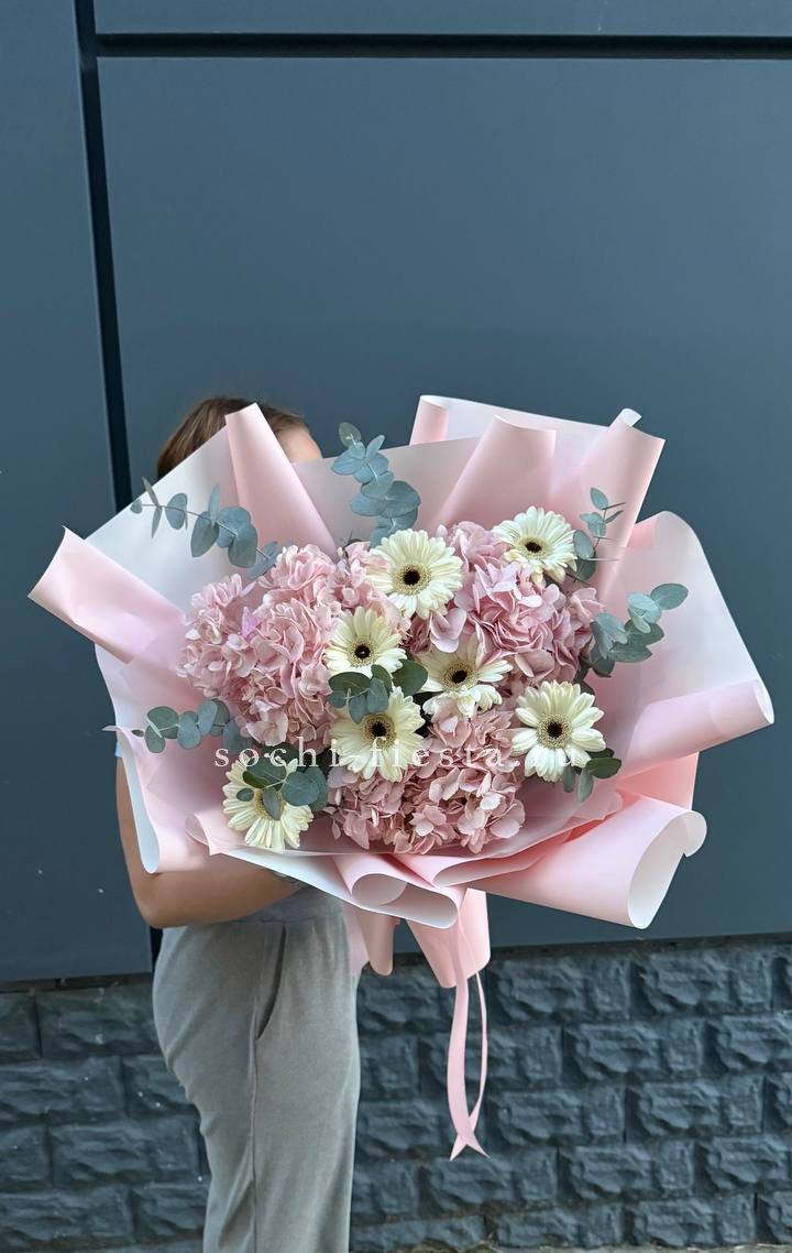 диантус, эустома, гортензия, хайди, эвкалипт, озатамус, пленка.