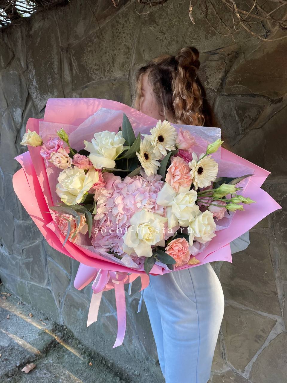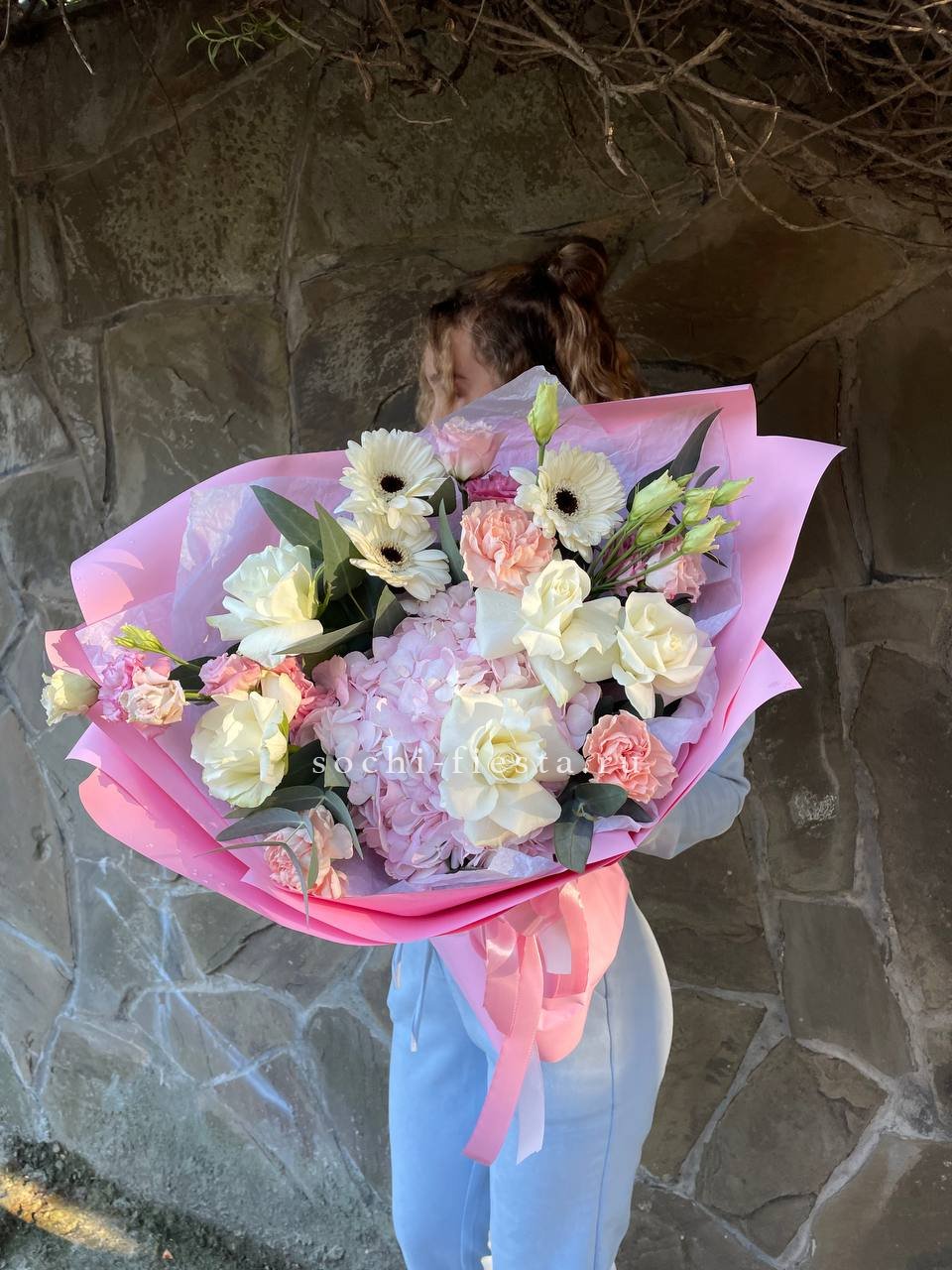 гербера, диантус, гортензия, бомбамстик, озатамус в нежном оформлении.