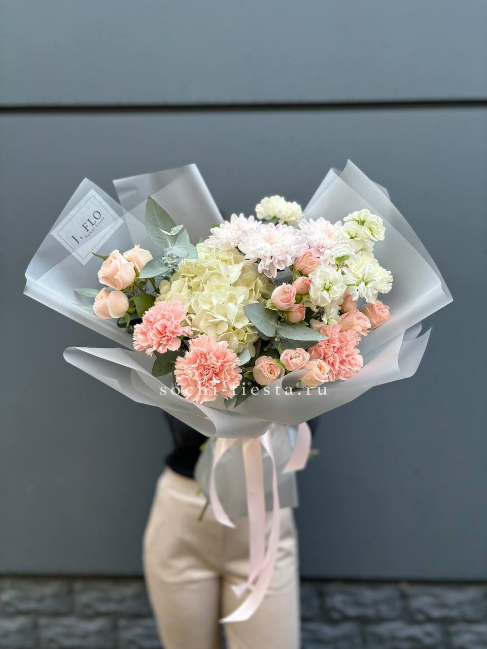 Этот пышный авторский букет напоминает нежное зефирное облако, в котором гармонично сочетаются объемные формы и изысканные оттенки. Композиция представляет собой микс из крупных соцветий гортензии и кустовых роз в пастельной гамме.