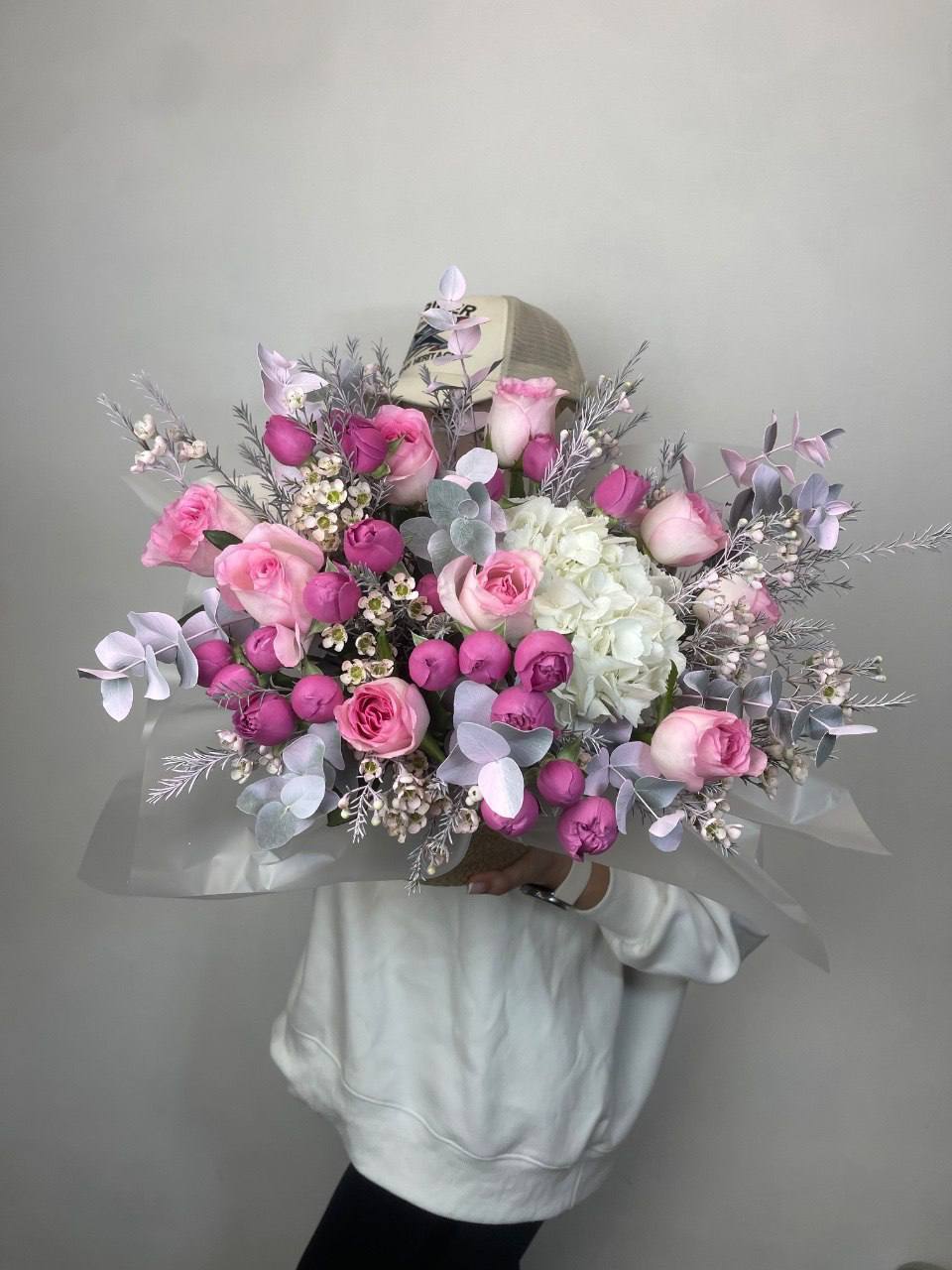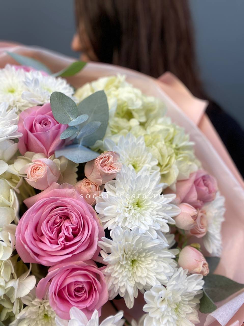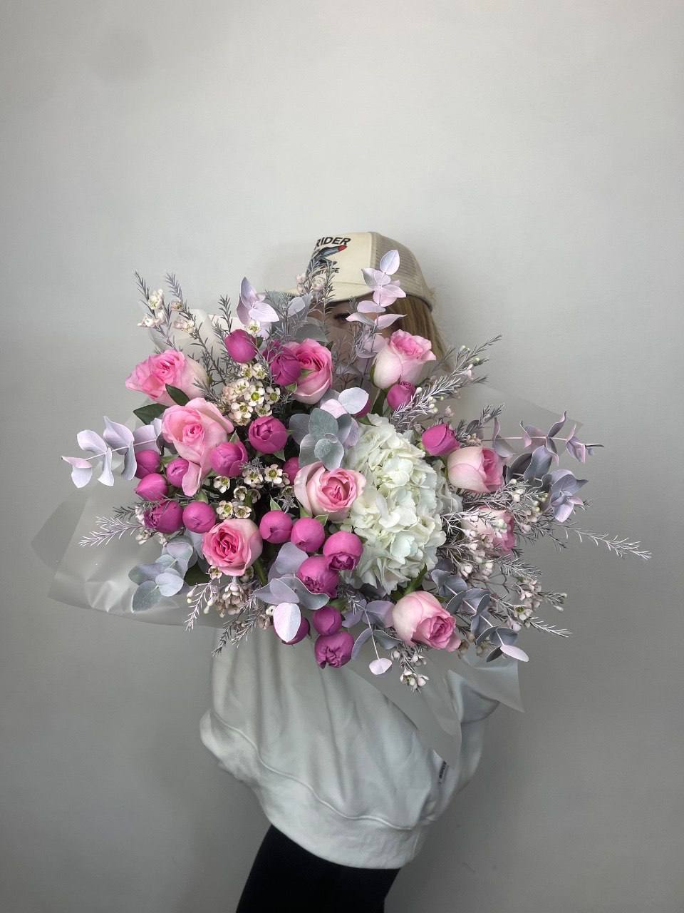 пионовидные розы мисти,  хлопка, эвкалипта, оформления.